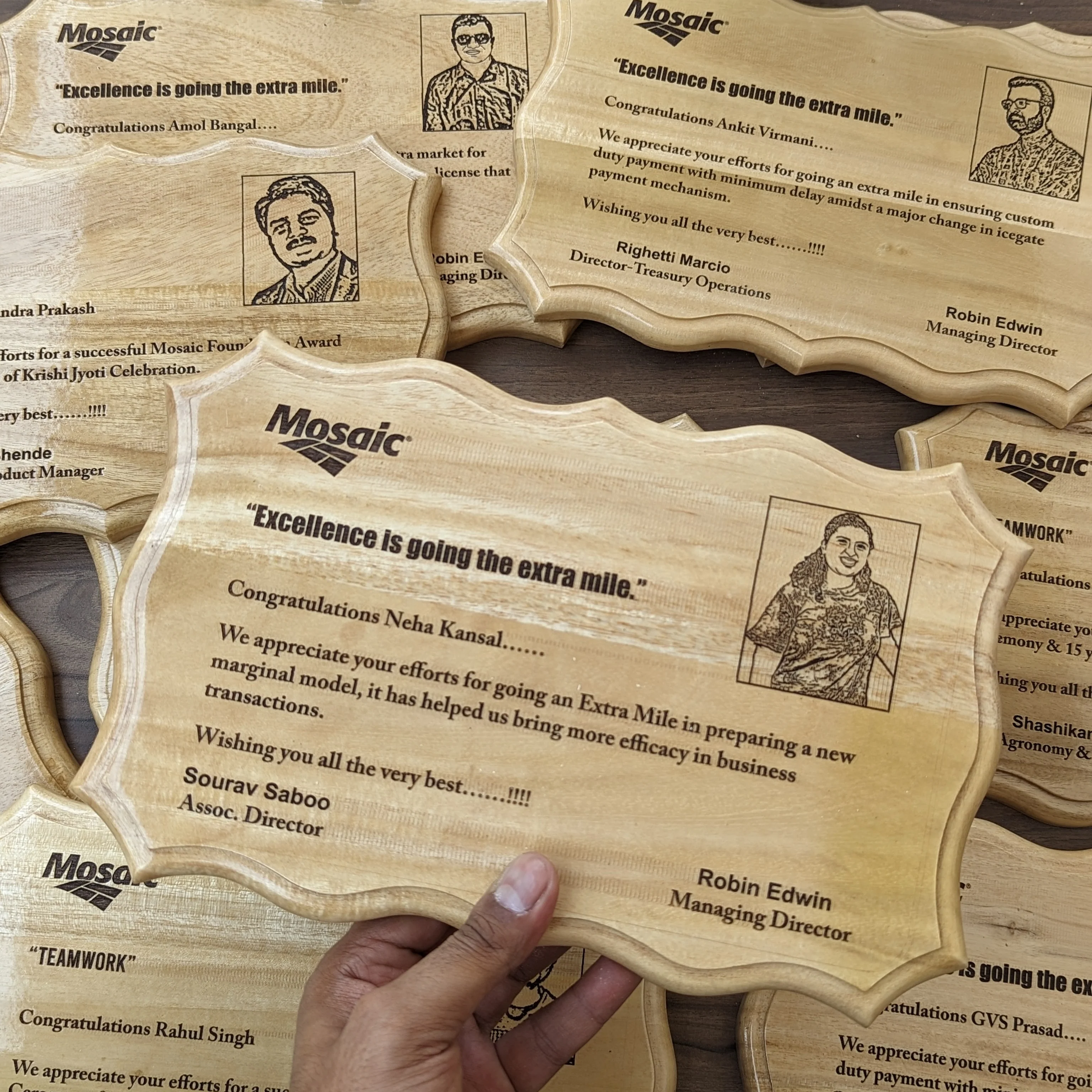 We use a distinctive wavy-edge design that gives the plaque a more handcrafted, premium feel compared to standard rectangular awards. You can choose between the bright, clean surface of Birchwood or the rich, deep tones of Mahogany. Our team handles the heavy lifting of the layout—arranging your message, the company logo, and the photo-to-sketch conversion—to make sure the final piece looks balanced and authoritative. We hand-polish each award with a High Gloss finish to give it a professional shine that protects the engraving for years.